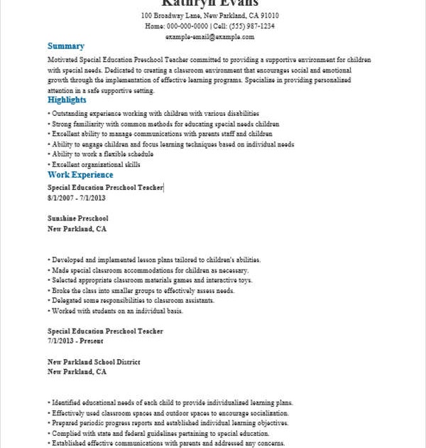 Free special education teacher resume 8. It covers summary statements as well as the skills, work history and education sections. Download the special education teacher resume template (compatible with google docs and word online) or see below for more examples. They are the people who convey their learning and experiences to their pupils. Write an engaging teacher resume using indeed's library of free resume examples and templates. Special education teacher resume samples writing a great special education teacher resume is an important step in your job search journey. Customized samples based on the most contacted special education teacher resumes from over 100 million resumes on file. Creative special education teacher resume example guide getting hired by the newest schools means your resume has to be up to the task. Typical work activities mentioned in a special education teacher resume sample are preparing lessons, developing learning resources, assessing learning needs, advising parents. These cover letter and resume templates are designed with teachers in mind! Start with your last job and work backwards. Special education teacher resume examples. 100's stunning designs that will make you stand out and highlight your skills and expertise.